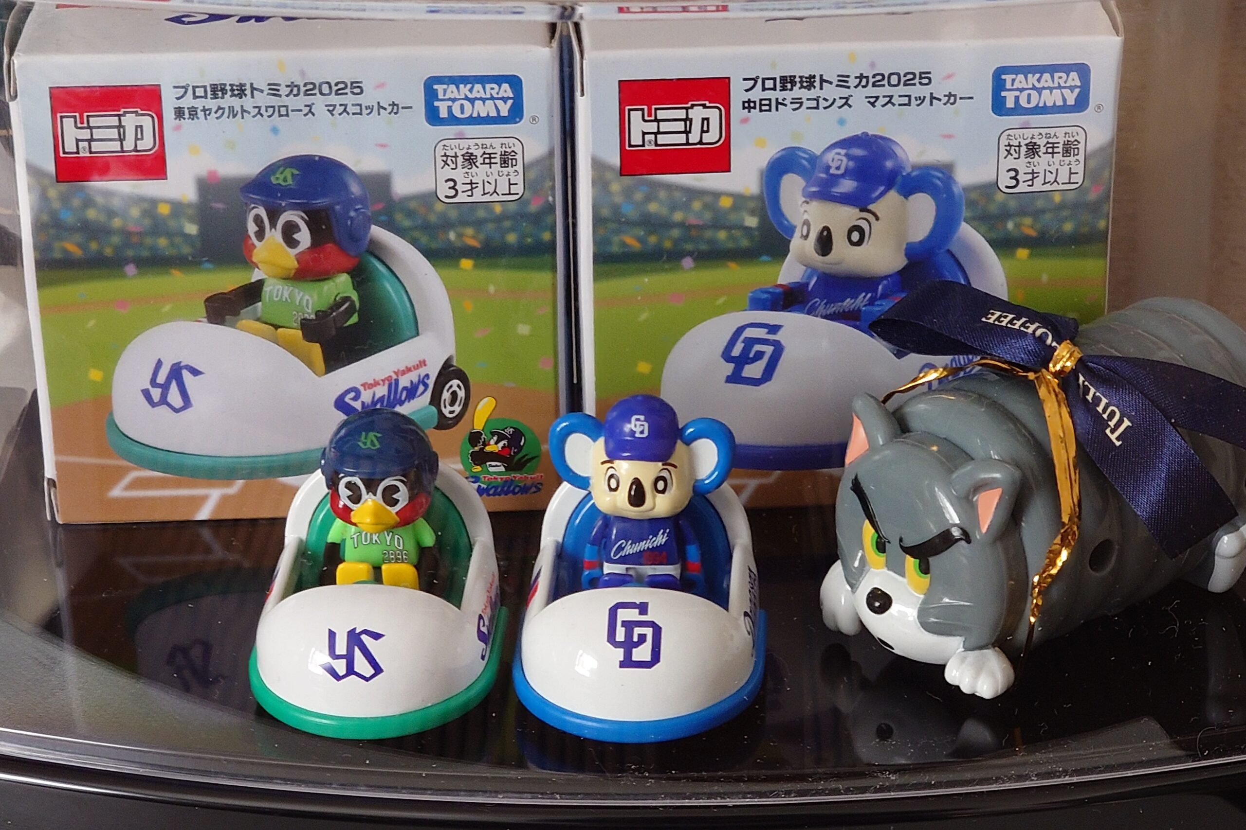 並べてみたところ少しゆとりがあったので、マックのハッピーセットで引き当てたトムも一緒に飾りました。