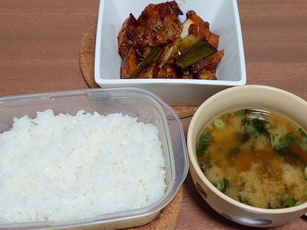 “豚バラじゃがいもネギ炒め 濃厚黒醤油味”みたいなネーミングのやつ。